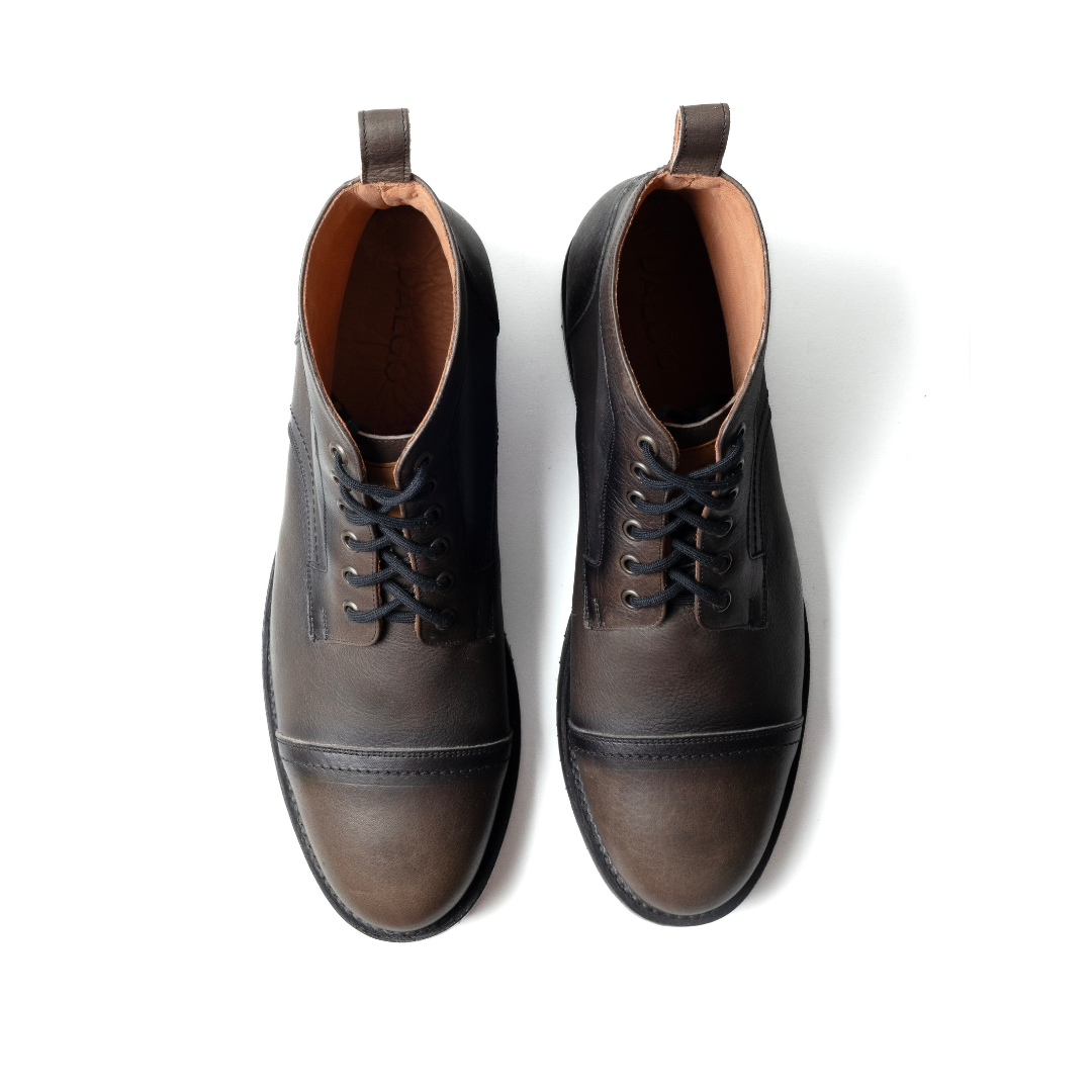 Handcrafted leather boots with a sleek graphite finish, designed for durability and timeless style.