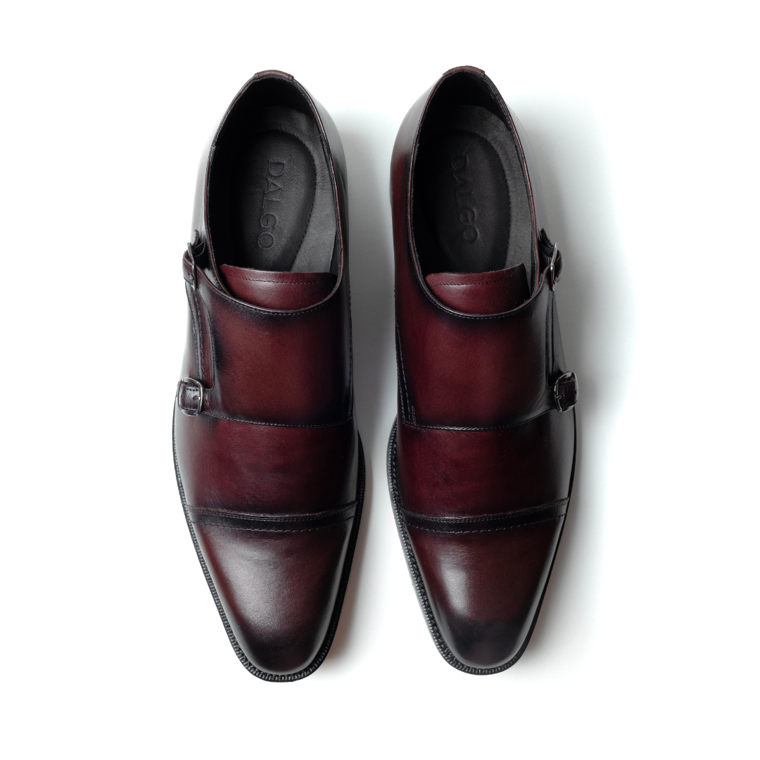 Expertly handcrafted from high-quality box calf leather, these shoes feature a deep burgundy finish with a sophisticated burnished toe for added character. The double buckle design offers a distinctive alternative to traditional lace-ups, combining modern style with classic heritage. Ideal for formal events or elevating your everyday office look, these monk straps deliver unmatched comfort, style, and durability.