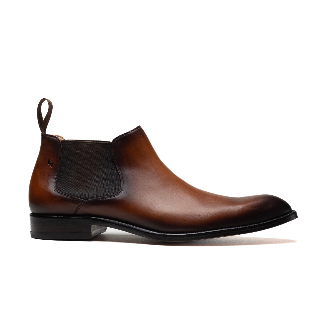 These sleek Chelsea boots are crafted from smooth leather with a refined burnished finish, offering effortless style and versatility. Featuring elastic side panels and pull tabs for easy slip-on wear, they’re the perfect choice for elevated casual looks or sharp urban ensembles.