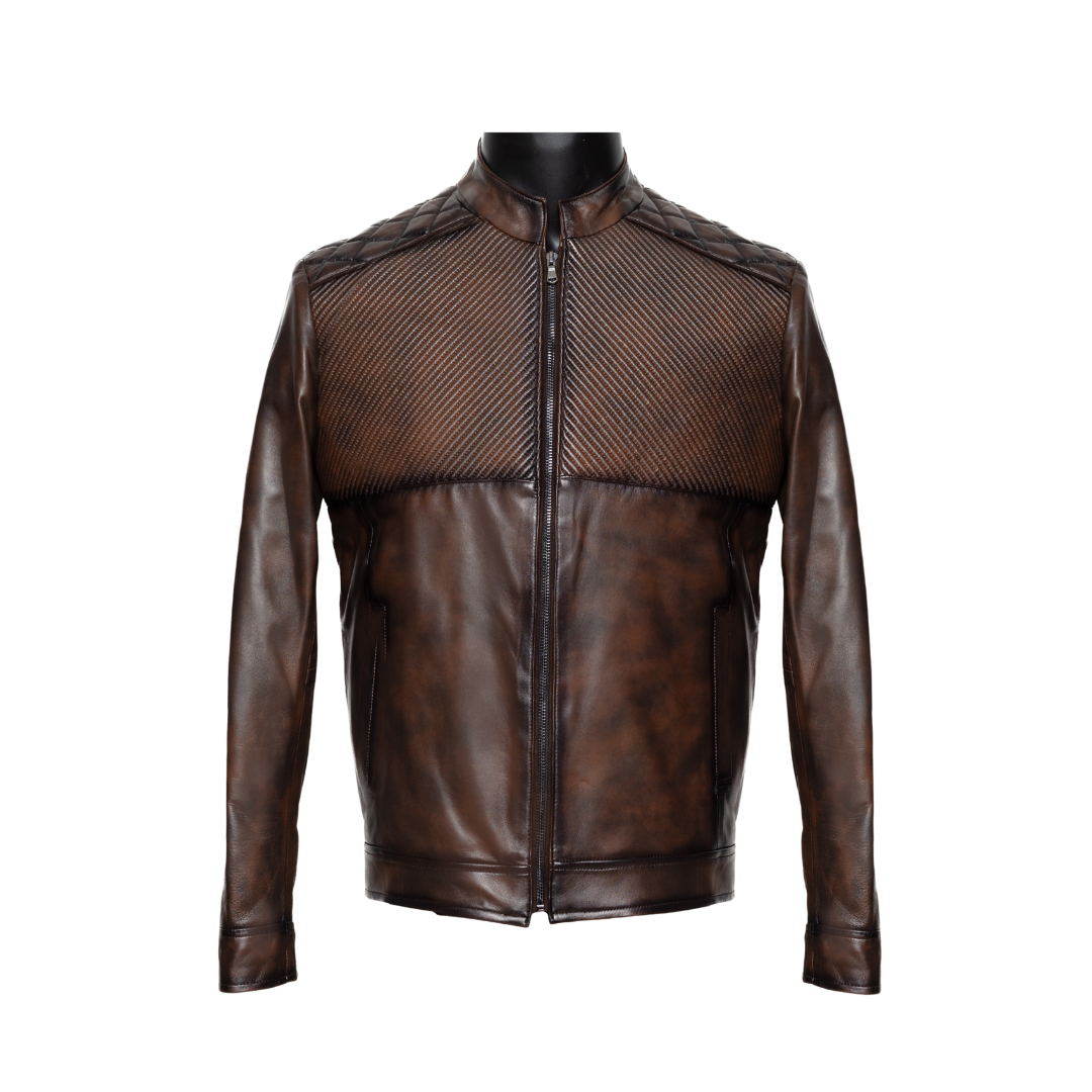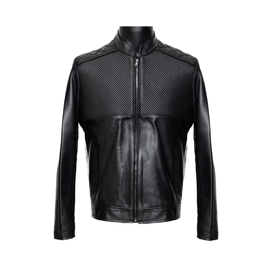 Made from high-quality calf leather, this jacket stands out through its subtly textured upper panel, offering a refined modern contrast.
